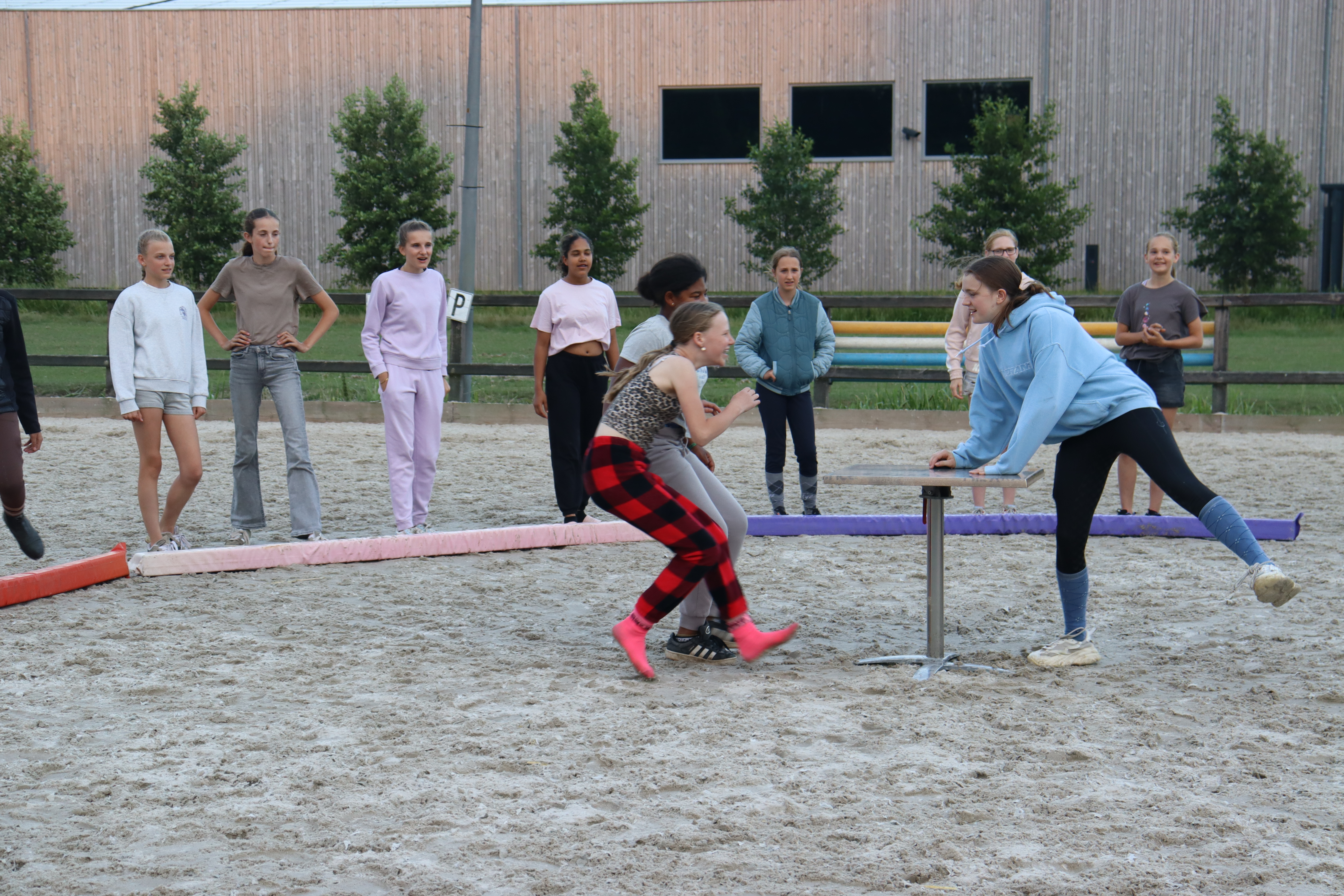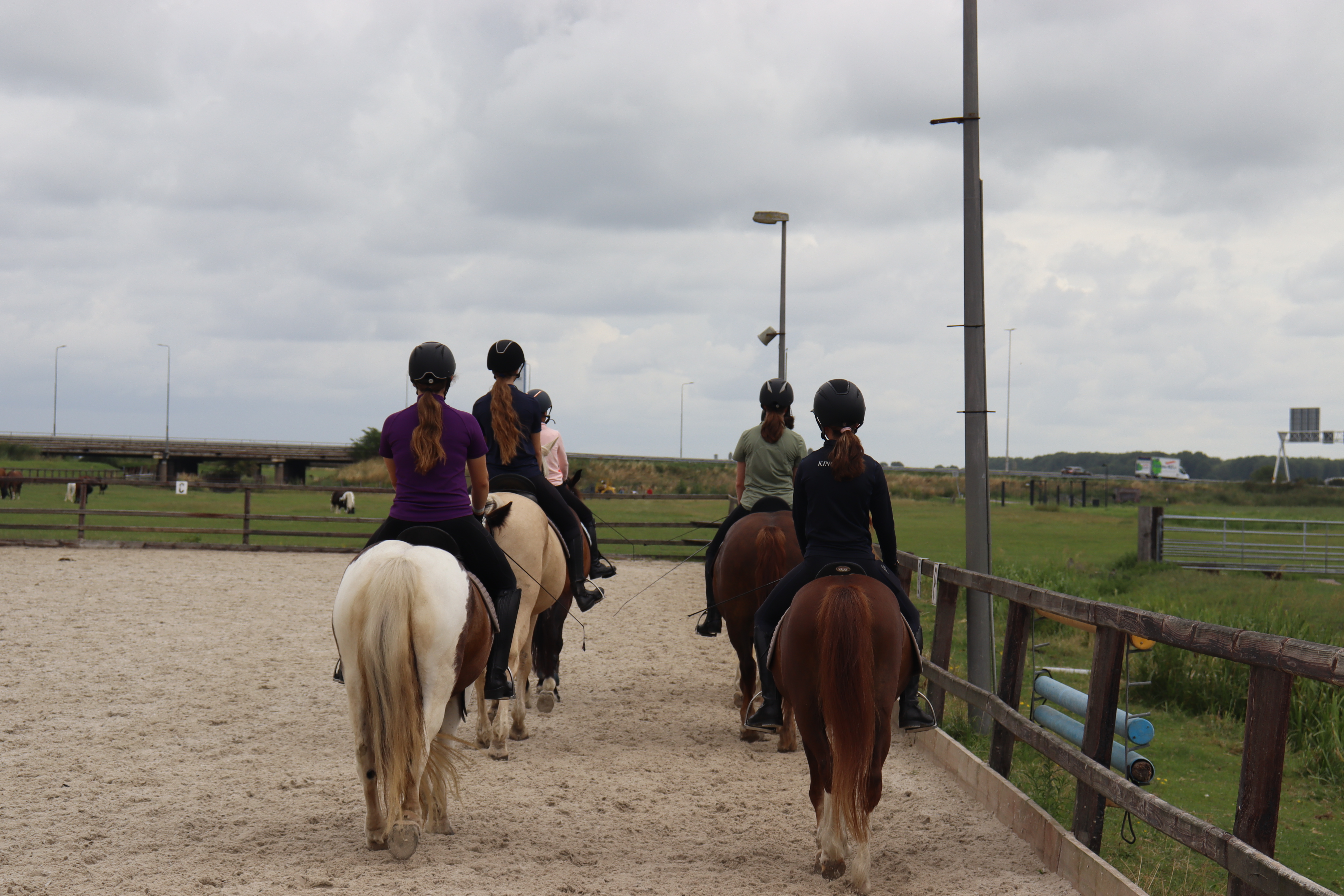 Elke dag beginnen we met de paarden in de wei zetten, voeren, opstrooien, uitmesten en vegen. Als dit klaar is, is er tijd voor een bekertje limonade met wat lekkers en gaat de eerste groep rijden. Wij doen elke dag wat anders met het rijden. Dit kan bijvoorbeeld zijn; dressuur, springen, een buitenrit, spelletjes of schriktraining. Terwijl de eerste groep aan het rijden is, zal de andere groep bezig gehouden worden met bijvoorbeeld een stukje theorie of voltige.