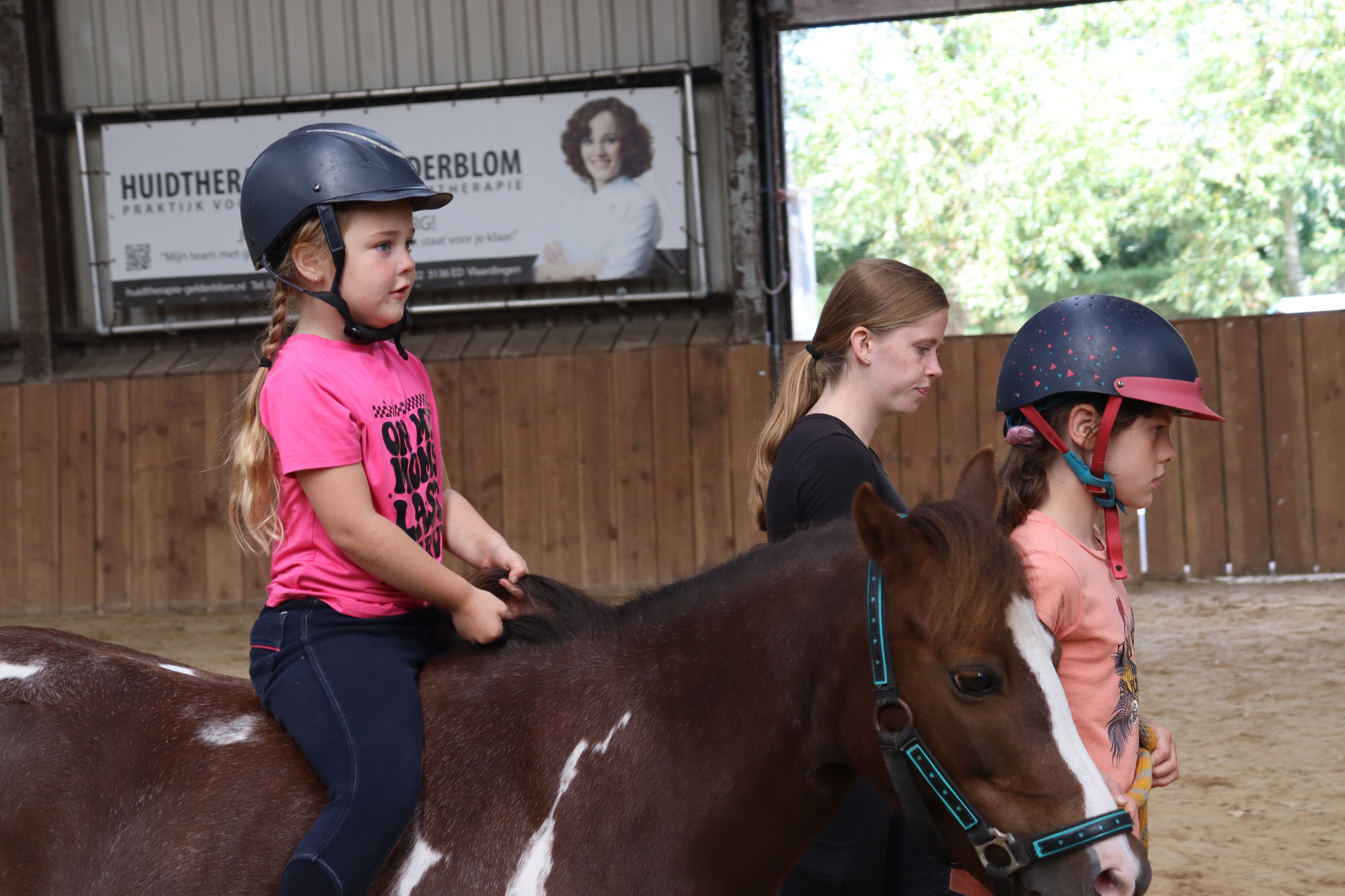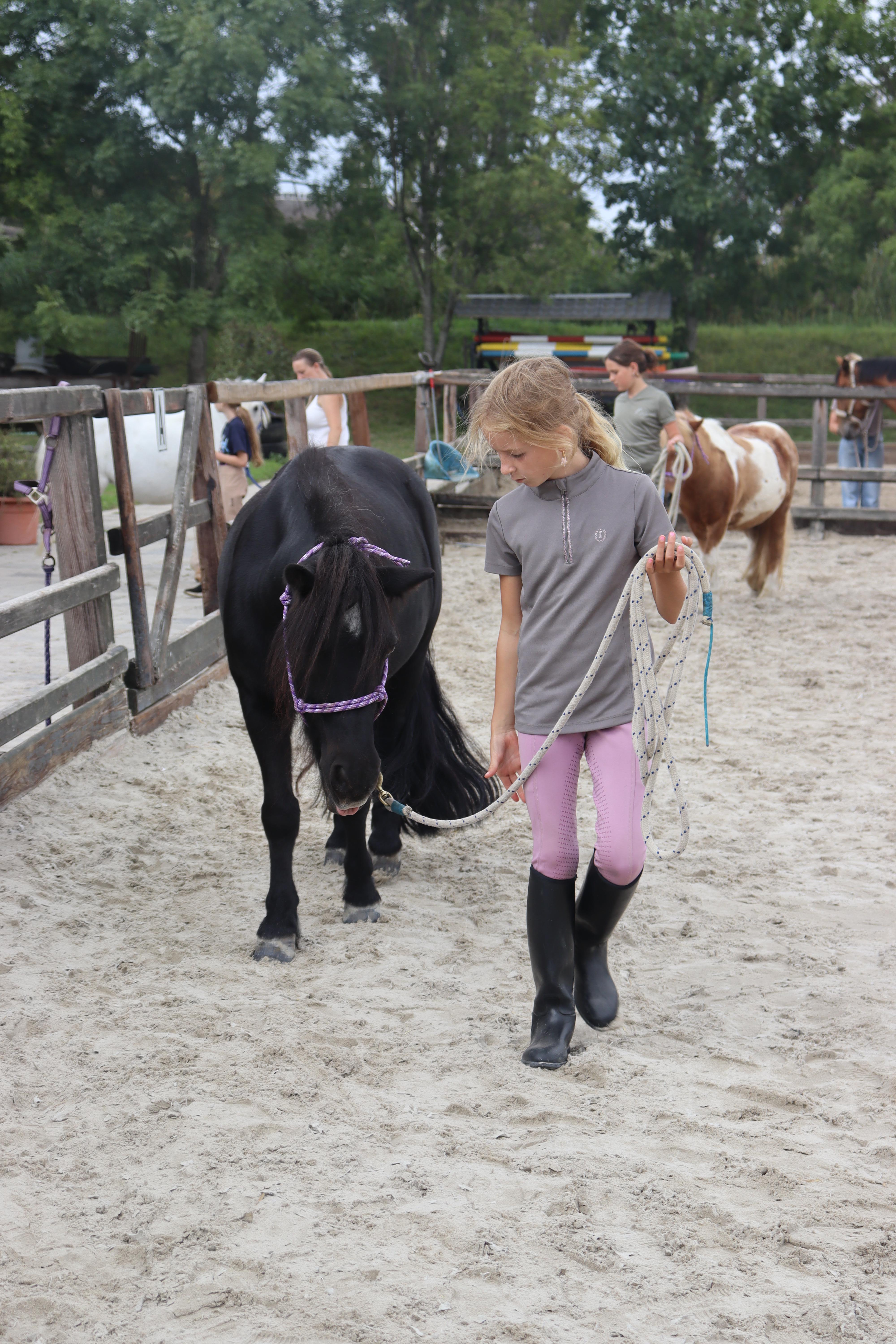 Natuurlijk leren de kinderen ook hoe het halster, hoofdstel, singel en zadel om en op moeten, hoe ze de pony poetsen en verzorgen.